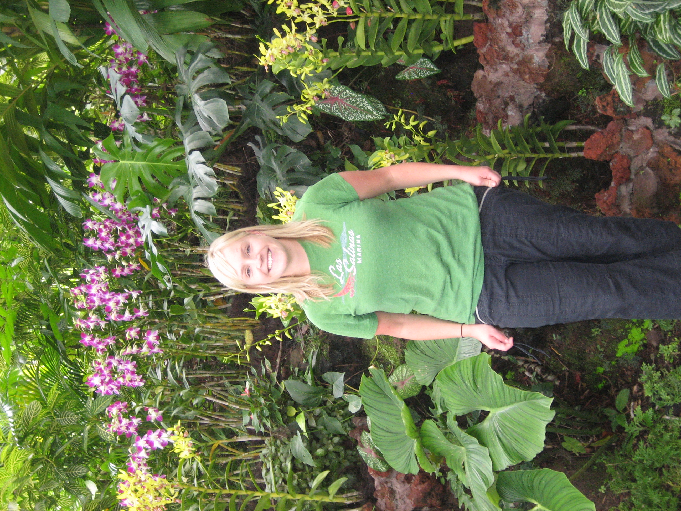 These are just a few of the orchids in the outside portion of the Orchid Garden, but where the fun really starts is the Mist House. The Mist House is where they keep the rare, fancy, expensive crazy cool orchids. There’s a dude in there that just walks around lovingly caressing each orchid and whispering sweet nothings in their ears. Okay not really but that’s how it seems. I took some pics in the Mist House, and I also met a nurse from Pennsylvania (visiting for a big nursing convention) and she took a shot of me standing by some of the orchids. She didn’t give me the “one-two-three” countdown so I wasn’t ready at all, but oh well.
