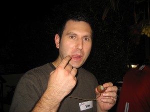 I got it all down. In fact, I couldn’t stop taking bites, even though I hated it. It was a trainwreck. I just couldn’t stop. John just had one tiny bite. Wimp. Then he moved on to lychee. Mmmm lychee. We just love lychee.Â
