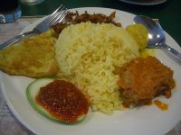 Anyway, the nasi lemak I had was from a very popular stall known for it’s fragrant rice cooked in coconut milk. Their standard version of nasi lemak is coconut rice, fried egg, fried chicken, chili, a weird flat fish-patty thing and dried anchovies. It was really all very good. The chili was great, the rice was perfect and the fried chicken rocked. The anchovies weirded me out a bit since you eat them bones and all (they’re just dried). As usual, I ate everything on my plate — the anchovies aren’t so bad once you get over the strong fishiness of them.