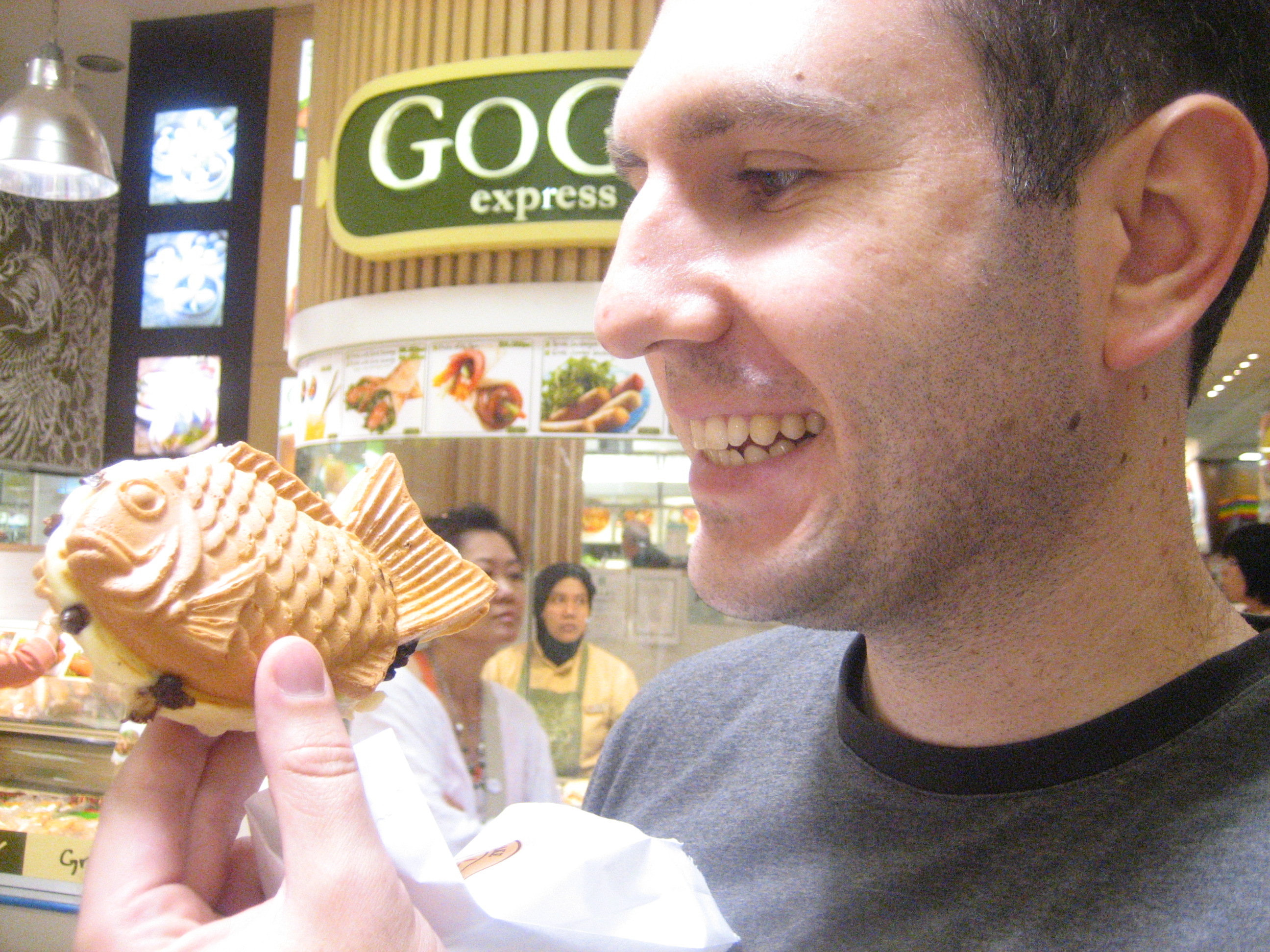 So at the bottom level they have this food court with tons and tons of food stalls. Lots of your basic Singapore offerings like chicken rice and other things that I can’t remember right now, and also lots of fancy Japanese ice creams and chocolates and these awesome Japanese pancakes at this place called Mr. Obanyaki. Basically, it’s a pancake shaped like a fish, and then you can have whatever treats inside that you choose. Of course John chose chocolate chips, because chocolate chips are awesome. So it’s a big fish-shaped pancake filled with chocolate. Pretty much nothing better than that right? Right.