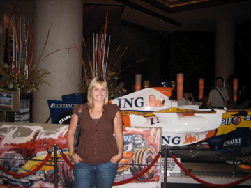 Many of Singapore’s city streets were closed off to make the racetrack, which had lots of twists and turns and gave the drivers a nice tour of Singapore. Not that they could see anything going 300 kilometers per hour (see how I used the metric system there?). Tons and tons of people went down to see the race, paying thousands of dollars for passes to get into the grandstands. We didn’t have tickets, but we got lucky enough to go to a hotel room overlooking part of the course for wine and cheese. There was even a car in the lobby.